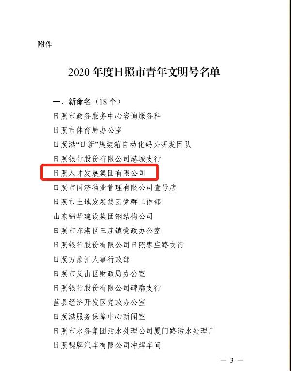 近日,在共青團日照市委公布的2020年度日照市青年文明號名單中,日照人才發(fā)展集團位列全市18個新命名青年文明號集體名單。日照人才發(fā)展集團自成立以來,高度重視青年工作,扎實開展青年文明號創(chuàng)建活動,生動的展示了青年敬業(yè)、協(xié)作、創(chuàng)優(yōu)、奉獻(xiàn)的良好精神風(fēng)貌。日照人才發(fā)展集團將以此榮譽為契機,再接再厲,不斷創(chuàng)新服務(wù)方式,組織動員廣大青年立足崗位、創(chuàng)先爭優(yōu),推動全市青年文明號創(chuàng)建工作再上新水平,為我市改革發(fā)展貢獻(xiàn)新的青春力量。