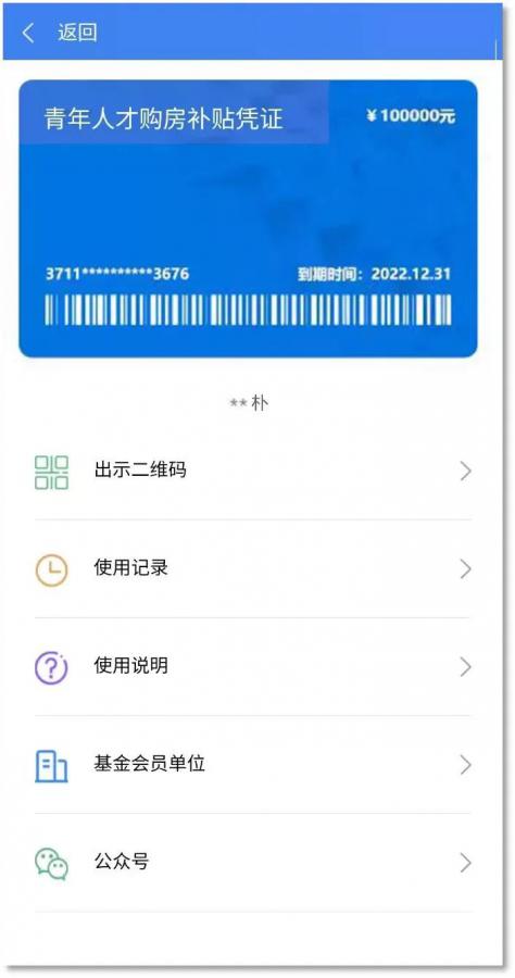 6.憑證發(fā)放。公示完成后,青年人才自動獲取“青年人才購房補(bǔ)貼憑證”,并可在該頁面查看憑證基本信息、使用記錄、使用說明、基金會員單位等。