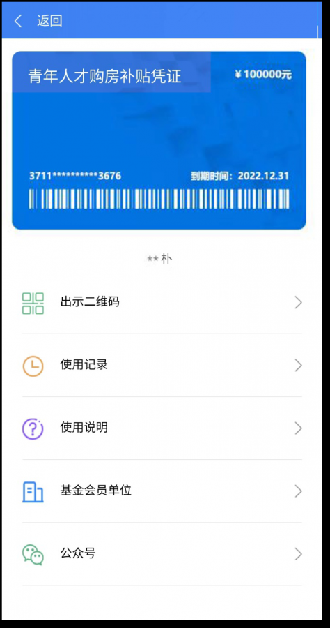 6.憑證發(fā)放。公示完成后,青年人才自動(dòng)獲取“青年人才購(gòu)房補(bǔ)貼憑證”,并可在該頁(yè)面查看憑證基本信息、使用記錄、使用說(shuō)明、基金會(huì)員單位等。