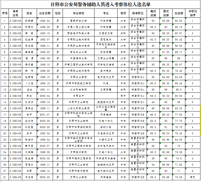 2020年日照市公安局警務(wù)輔助人員招聘進入考察體檢范圍人員。
