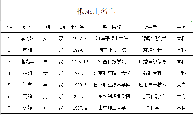 日照力誠人力資源有限公司6月1日公開招聘勞務(wù)派遣人員,經(jīng)過面試、考察、體檢,根據(jù)成績排名擬錄用7人。錄用人員采取勞務(wù)派遣的形式派遣到用工單位工作,試用期 1個月,試用期經(jīng)考核不合格的予以辭退。現(xiàn)將擬錄用人員名單公示如下,公示期限自2021年6月9日至6月15日,公示期內(nèi)如有異議,可向日照力誠人力資源有限公司反映,聯(lián)系電話:3693966,單位地址:東港區(qū)學(xué)苑路217號日照文化創(chuàng)意產(chǎn)業(yè)園2樓。