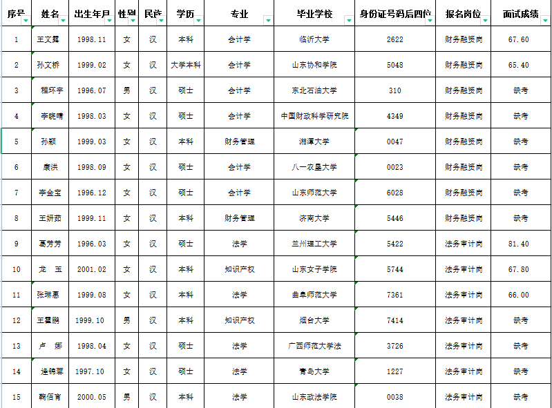 山東種業(yè)集團(tuán)魯南有限公司公開(kāi)招聘工作人員,經(jīng)過(guò)網(wǎng)上報(bào)名、資格初審、現(xiàn)場(chǎng)面試等環(huán)節(jié)?,F(xiàn)將面試人員成績(jī)公示如下,公示期限自2022年6月13日至2022年6月17日,公示期內(nèi)如有異議,可向山東種業(yè)集團(tuán)魯南有限公司反映,聯(lián)系電話:0633-6107701 。