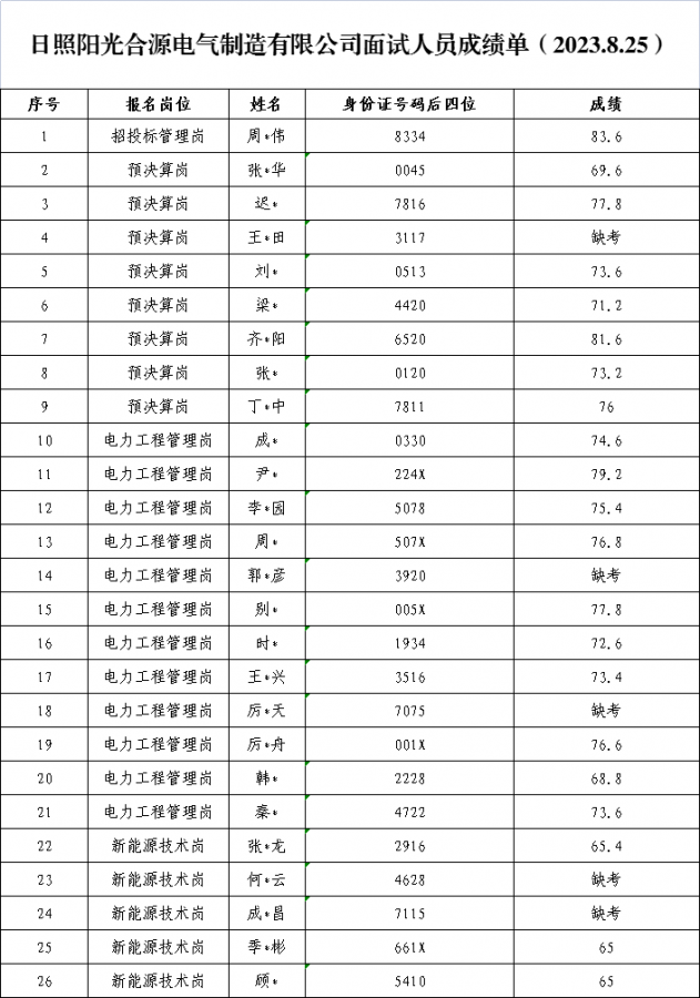 根據(jù)《日照陽光合源電氣制造有限公司公開招聘勞務派遣人員簡章》,本次面向社會公開招聘4個崗位,4名勞務派遣人員。經(jīng)過公告發(fā)布、網(wǎng)上報名、資格初審,共26名報名人員符合面試條件。面試于2023年8月25日上午在日照人才發(fā)展集團舉行?,F(xiàn)將面試成績公示如下(詳見附件),公示期限自2023年8月25日至8月31日,公示期內(nèi)如有異議,可向日照陸橋人力資源有限責任公司反映,聯(lián)系電話:0633-8778515,單位地址:山東省日照市東港區(qū)日照國際財富中心A棟25樓(山東省日照市東港區(qū)石臼街道海曲東路396號)