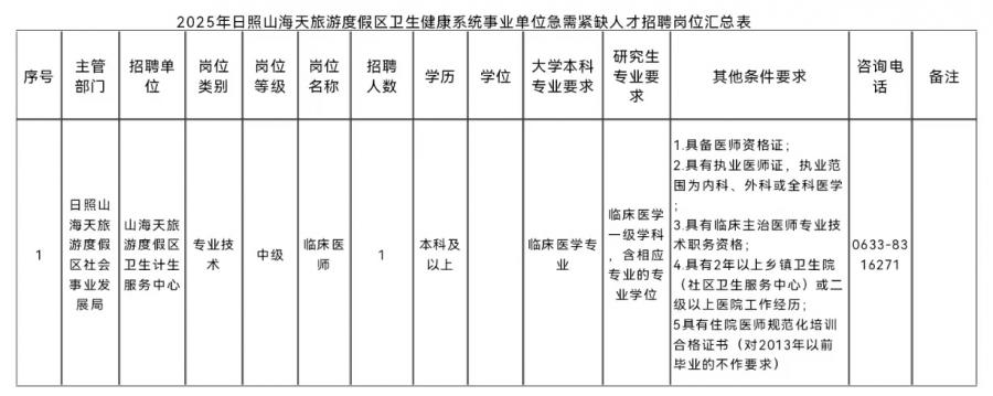 2025年度日照山海天旅游度假區(qū)衛(wèi)生健康系統(tǒng)事業(yè)單位公開招聘急需緊缺人才的崗位條件、招聘人數(shù)等具體要求見《2025年日照山海天旅游度假區(qū)衛(wèi)生健康系統(tǒng)事業(yè)單位公開招聘急需緊缺人才崗位匯總表》。