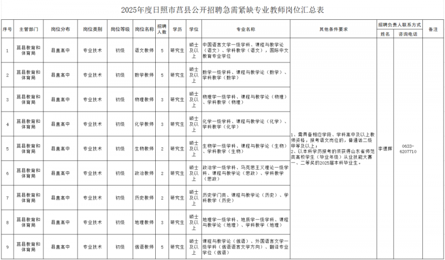為進(jìn)一步優(yōu)化莒縣高中學(xué)校教師隊(duì)伍結(jié)構(gòu),根據(jù)事業(yè)單位公開招聘有關(guān)規(guī)定,結(jié)合高中學(xué)校崗位空缺情況和工作需要,現(xiàn)將2025年日照市莒縣公開招聘急需緊缺教師有關(guān)事項(xiàng)公告如下:(一)國內(nèi)普通高等院校和經(jīng)教育部學(xué)歷學(xué)位認(rèn)證的國(境)外高校畢業(yè)的2025屆碩士及以上研究生;(二)獲得山東省師范類高校學(xué)生(畢業(yè)年級(jí))從業(yè)技能大賽一、二等獎(jiǎng)的2025屆本科(含)以上畢業(yè)生(不含山東省屬公費(fèi)師范生,山東省屬公費(fèi)師范生按照山東省屬公費(fèi)師范生就業(yè)政策和師范生所簽三方協(xié)議進(jìn)行就業(yè))。2.遵守中華人民共和國憲法和法律,擁護(hù)中國共產(chǎn)黨領(lǐng)導(dǎo)和社會(huì)主義制度;3.熱愛教育事業(yè),具有良好的道德品行和適應(yīng)崗位的身體條件、心理素質(zhì);4.年齡應(yīng)在35周歲以下(1989年3月以后出生),博士研究生年齡可放寬到40周歲以下(1984年3月以后出生);6.具有與應(yīng)聘學(xué)科一致的相應(yīng)學(xué)段及以上教師資格證書,暫未取得的須在辦理聘用手續(xù)前取得。普通話標(biāo)準(zhǔn)須達(dá)到二級(jí)乙等及以上,報(bào)考語文教師崗位的須達(dá)到二級(jí)甲等及以上;普通高校2025年應(yīng)屆畢業(yè)生,符合教育部辦公廳《關(guān)于統(tǒng)籌全日制和非全日制研究生管理工作的通知》(教研廳〔2016〕2號(hào))和《教育部辦公廳等五部門關(guān)于進(jìn)一步做好非全日制研究生就業(yè)工作的通知》(教研廳函〔2019〕1號(hào))規(guī)定自2016年12月1日后錄取且2025年畢業(yè)的非全日制研究生,與國(境)內(nèi)普通高校2025年應(yīng)屆畢業(yè)生同期畢業(yè)的留學(xué)回國人員的學(xué)歷、學(xué)位證書,應(yīng)于2025年7月31日以前取得。定向、委培畢業(yè)生報(bào)考,須征得定向、委培單位同意。現(xiàn)役軍人,在讀的非應(yīng)屆畢業(yè)生,因犯罪受過刑事處罰的人員,被開除黨籍的人員,被開除公職的人員,被依法列為失信聯(lián)合懲戒對(duì)象的人員,以及法律法規(guī)規(guī)定不得聘用的其他情形人員不得應(yīng)聘。應(yīng)聘人員不得報(bào)考有《事業(yè)單位人事管理回避規(guī)定》(人社部規(guī)〔2019〕1號(hào))規(guī)定情形的崗位。